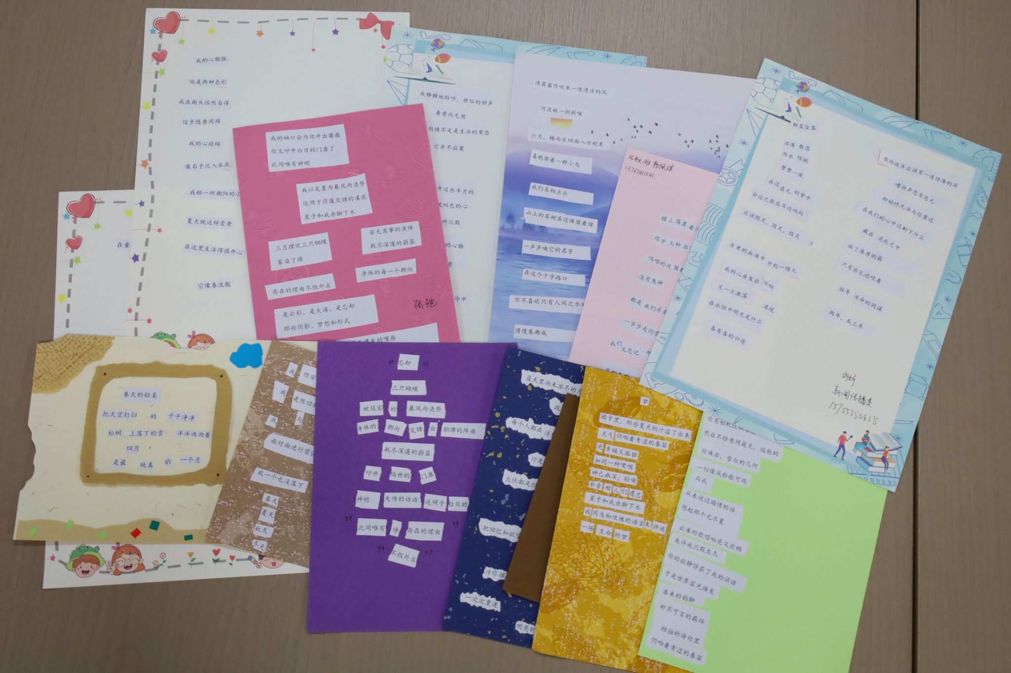 活动现场,同学们围坐桌前,桌上摆放着各类卡纸、印有经典诗作的纸张、剪刀与胶水等工具。来自生物科学专业2023(4)班的马俊杰同学专注地裁剪着诗句,他分享道:“有些句子一读,故乡的画面便浮现眼前。通过拼贴,我把不同诗人的句子连成了自己的乡愁。”他表示,拼贴诗让他感受到创作并非遥不可及,真实的情感流露便是最美的诗行。