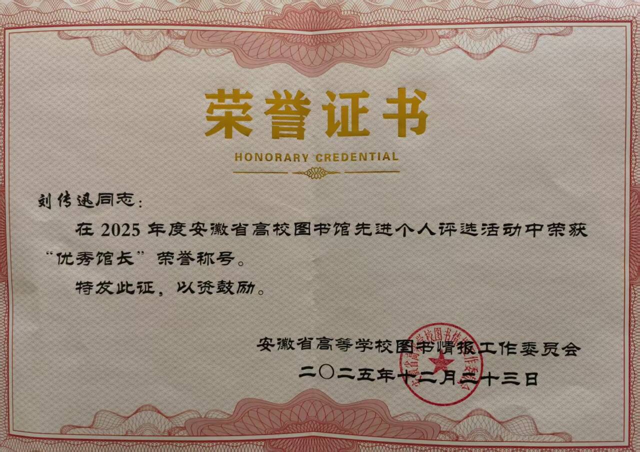会议表彰了安徽省高校图书馆2025年度先进个人和先进集体。我馆作为“安徽省高校图书馆2025年度先进集体”接受颁奖,图书馆副馆长刘传迅荣获“优秀馆长”荣誉称号,唐莉、胡瑞荣获“先进工作者”荣誉称号。
