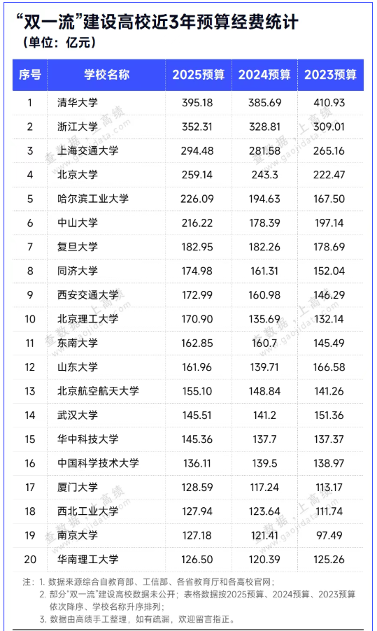 整体来看,全国有20+所头部高校迈入“百亿俱乐部”。2025年预算经费方面,29所高校超百亿,其中预算经费在300亿元以上的高校共计三所,分别是清华大学(395.18亿元)和浙江大学(352.31亿元)。