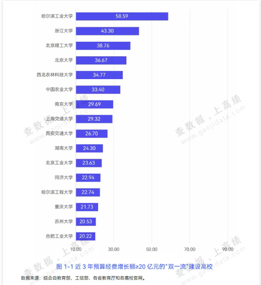 对比2025和2023年预算经费,哈尔滨工业大学(58.59亿元)的预算增长超50亿。此外,3年预算经费增长超30亿的高校还有浙江大学(43.30亿)、北京理工大学(38.76亿)、北京大学(36.67亿)、西北农林科技大学(34.77亿)和中国农业大学(33.40亿)。