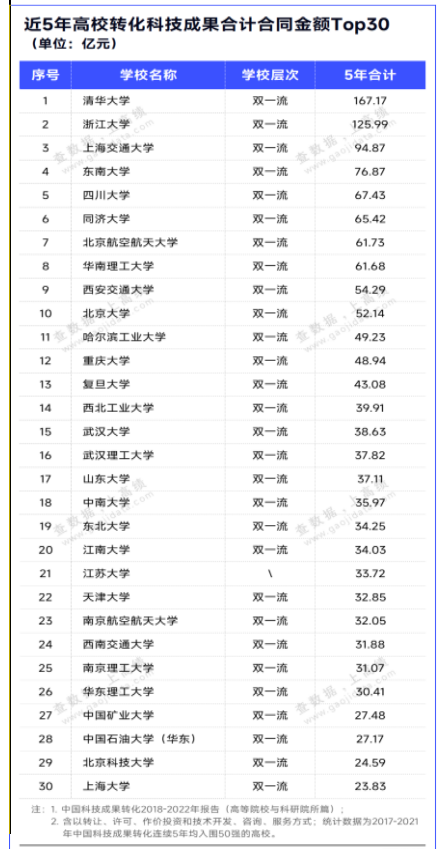 2023年,高等院校以转让、许可、作价投资和技术开发、咨询、服务方式转化科技成果合同金额排行中,清华大学位居全国高校第1名,相较去年上升2名,重返榜首。上海交通大学紧随其后,位居全国高校第2名,与去年持平;华中科技大学相较去年上升3名,今年进入全国前三甲,表现亮眼。