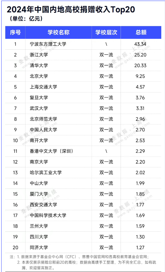 高绩(ID:gaojidata)根据民政部民政一体化政务服务平台——慈善中国及各高校官网公布的基金会年报整理了2024年内地高校捐赠收入情况,以反映我国高校最新捐赠收入情况。(需要说明的是,由于财会流程、记账周期等因素影响,捐赠新闻报道可能与高校基金会年报收入总额存在出入。)