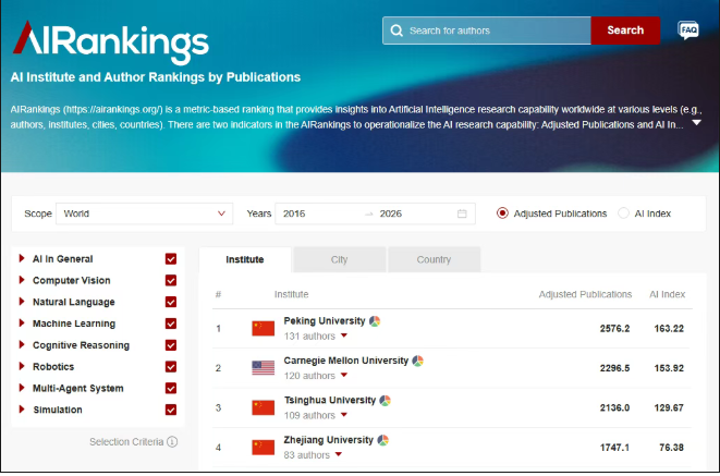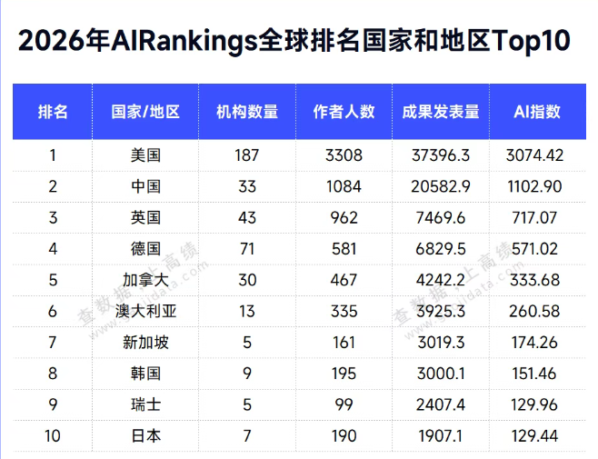 日前,AIRankings公布了2026年人工智能全球机构排名结果,共有581所高校和科研机构上榜。