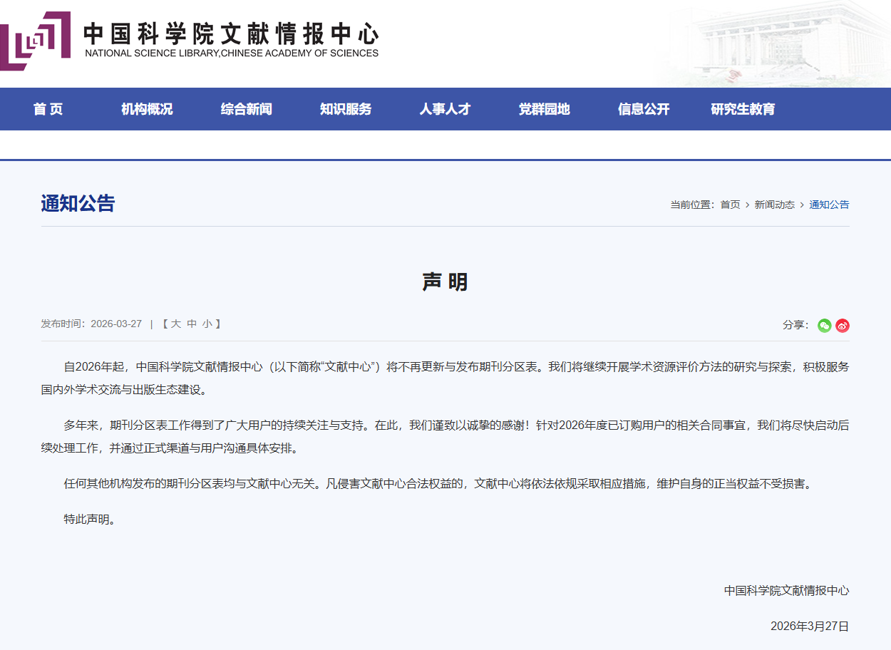 3月27日,中国科学院文献情报中心发布官方通告自2026年起,将不再更新与发布期刊分区表。该中心将继续开展学术资源评价方法的研究与探索,积极服务国内外学术交流与出版生态建设。